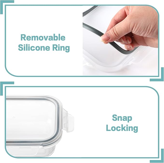 - [BPA Free & Easy to Clean] The material of BAP-Free ensure the food safety and the transparent glass material allows you to see clearly inside the container. Removable silicone ring is easy for clean without absorbing stains when you reuse it. In order to prevent it sticking to the containers, please must wash the lids and containers before put them away.
